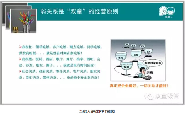 很多(duō)企業主總是(shì)處於這樣(yàng)的狀態(tài),我很(hěn)忙:領導吃飯、客戶吃飯(fàn)、朋(péng)友吃飯、同學吃飯……就是沒有時(shí)間在家吃飯!我很(hěn)累(lèi):飯局、酒(jiǔ)店、歌廳(tīng)、舞廳……就是沒有時間回家(jiā),更別說多陪家人。他(tā)們沒有時間(jiān),也不會覺得自己有自由,最後導致自(zì)己越來越忙,企業也做不好!