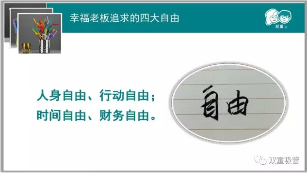 很多企業主都有(yǒu)這樣的痛(tòng)點:我很忙(máng)!每天(tiān)要(yào)處理各(gè)種(zhǒng)各(gè)樣的關係,每(měi)天連番的(de)應酬交際任務,根本沒有時間兼顧家(jiā)庭,自由更是無從談起!而當家人樓總卻認為(wéi)一個幸福老板必須要擁有四種“自由”,這話從何說起呢?接(jiē)下來吸管(guǎn)妞(niū)就向大家詳細(xì)闡釋一下吧!