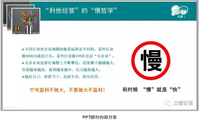 “利他經營”的慢哲學:太多企業選擇(zé)在規模上不斷攀比,結果攤(tān)子越鋪越大,負債越來(lái)越高,盈(yíng)利越來越少,壓力越來越大。其實“慢”的本(běn)質是不犯錯誤(wù)少走彎路,不斷積累,有(yǒu)時候“慢”就是(shì)“快”!