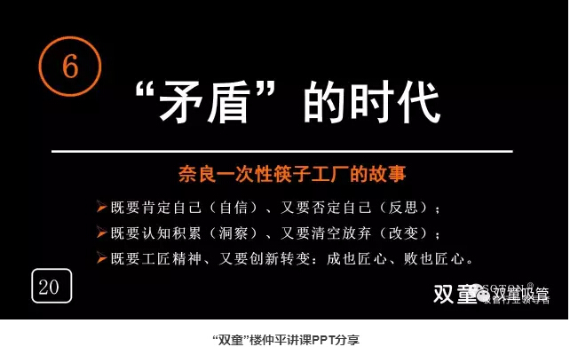 “矛盾”的時代:“.17c嫩嫩草色视频”樓仲平通過日本奈良一次性筷子的故事(shì)告訴大家成也工匠精神、敗也(yě)工匠(jiàng)精神(shén),沒有改變,“工匠”精(jīng)神也沒有用。作為創業者來講,我們(men)不能用過往的經驗來理解發生的一切(qiē),否則你會被時代所拋棄。在不同的時代,你對(duì)時間(jiān)和技(jì)術進步的理解是不一(yī)樣的,既要肯定自己、又要否(fǒu)定自己(jǐ);既要認知積累、又要清空放棄;既要工匠精神、又要創新轉變!