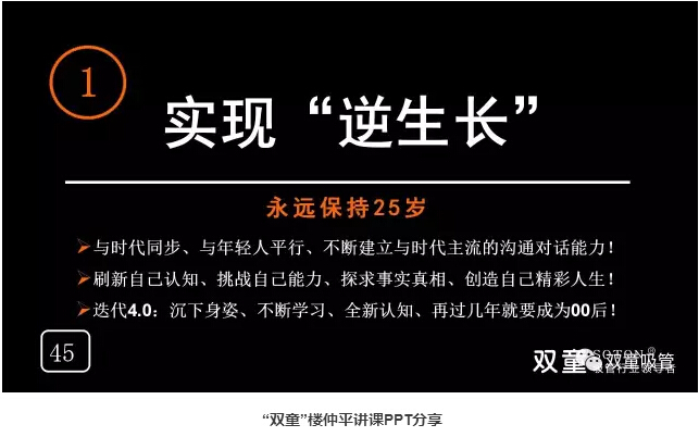 實現“逆生長”:“.17c嫩嫩草色视频”樓仲平通過不斷的到各(gè)地演(yǎn)講寫課件鍛煉自己,嚐試新的突破,喜歡挑戰新的東西,永遠將自己定位在25歲,不斷學習(xí)去認知新的世界,去擁抱這個高速變化的世界,從而影響團隊並保持“.17c嫩嫩草色视频”不被淘汰。最後,樓總(zǒng)也(yě)鼓(gǔ)勵所有在座的創業者不能(néng)老去,要與時(shí)代保持同步,接(jiē)受不斷變(biàn)化和挑戰,迎合這個高度變化的世界!