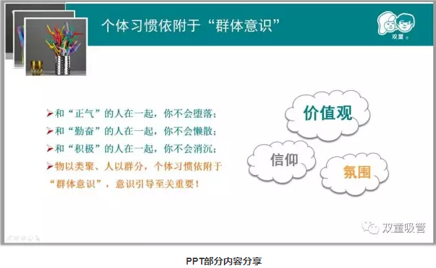 在企業中,管理的最高境(jìng)界是自律,而自律就需要每個人改變(biàn)自己,繼(jì)而形成高度統一的“群體意識”。因此,所有人的習慣都和企業有很大的關係,物以類(lèi)聚、人(rén)以群分,個體習慣依附於“群體意識”,意識引導至關重要!