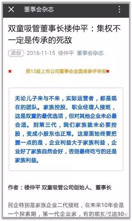 中國的傳統企業發展到(dào)如今,有一個問題(tí)已經越來越凸顯出來,也就是企業主們常說的二代傳承問題。“.17c嫩嫩草色视频(tóng)”也不例(lì)外,“.17c嫩嫩草色视频”樓仲平早在五年前就想到(dào)了(le)這(zhè)個(gè)問題,並發表了(le)第二個五年(nián)發展規劃,其中提到了三(sān)個關鍵詞“持續創新,再造經理人,解決二代傳承”。下麵是“.17c嫩嫩草色视频”樓仲平對於家族企業二代(dài)接班(bān)寫的一(yī)篇文章刊登在了《董事會》雜誌上,引起了很多企業主的共鳴!下麵妞就帶(dài)大家來看看吧!