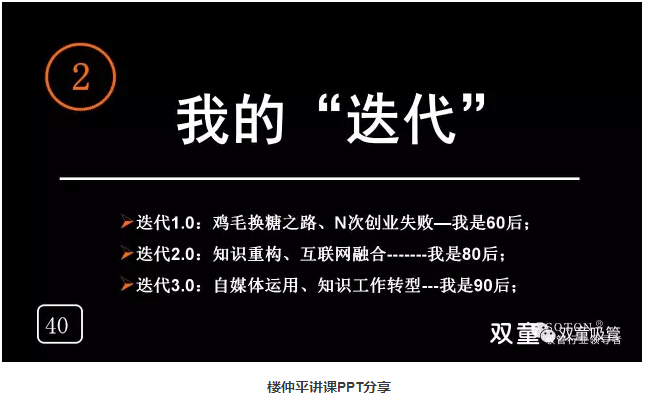 我的“迭代”:“雙(shuāng)童(tóng)”樓仲平通過自身不斷的學習:在浙(zhè)大學習進修、學習電腦設計,認知(zhī)到自媒體作用,與(yǔ)年輕(qīng)人鏈接、培養團隊,自己轉變教育工作……不斷否認自我、重新認知(zhī),實現迭代!