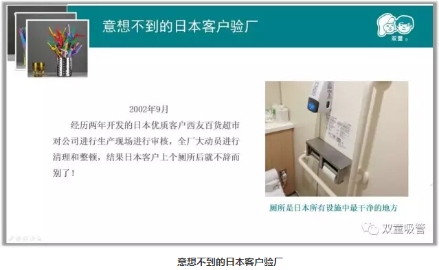 2002年9月,“雙(shuāng)童”花了兩年時間之久開發的(de)日本優質客戶要對公司生產現(xiàn)場進(jìn)行審核。為此(cǐ),“雙(shuāng)童”進行了全廠大動員,把當時北苑路3號租用廠(chǎng)房的(de)裏裏外外都(dōu)打掃得幹幹淨淨!終(zhōng)於,日本客戶到(dào)了,樓仲平在辦(bàn)公室裏等(děng)了許久卻(què)被告知:日本客戶上個廁所後就不辭而別了!事後公司才了解到,原來,日本人最注(zhù)重的就是廁所衛生,而當時“.17c嫩嫩草色视频”是租用的廠房廁所硬件條件有限,他們認為一(yī)個(gè)連廁所都不幹淨的企業做不出高品質的產品!