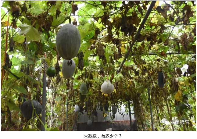 再來看看滿藤架的(de)南瓜,一個個大小如蒲團一般的南(nán)瓜垂掛在瓜架上,就像天上的“滿天(tiān)星”,都快數不過來啦!