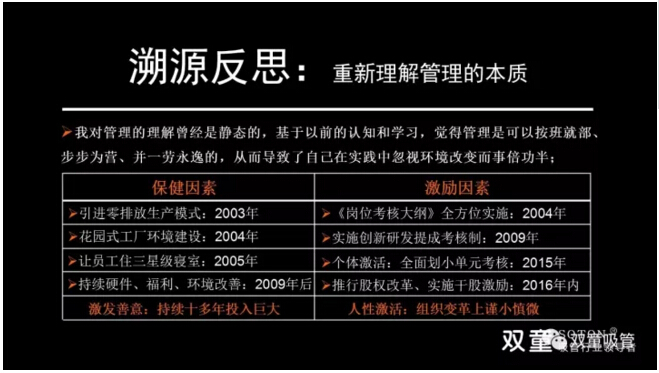 樓仲平分享道(dào):“我對(duì)管理(lǐ)的理解曾經是靜態(tài)的,基於(yú)以前的認知和學習,覺得管理是可以按(àn)部就(jiù)班、步步為營、並一勞永(yǒng)逸的,從而導致了自(zì)己在實踐中忽(hū)視環境改變而事倍(bèi)功(gōng)半。”現在,樓仲平也一直在反思,重新理解管(guǎn)理的本質!