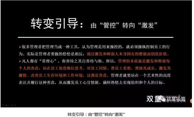 管理的本質是“管事(shì)”而非“管人”,通過願景展現(xiàn)、目標設立、規則訂立和激勵(lì)兌現來引導員工將組織目標轉化成個人目標,自願而高效地給予完成,從(cóng)而實(shí)現組織和(hé)個體的價值創造和共贏。同時,通過培訓、授(shòu)權和激勵,激發和釋放人本身固有的潛能而創造價(jià)值。所(suǒ)以,管理的本質管理不是管控、教條和賦予,而是在共同完成組(zǔ)織和個體目標(biāo)的過程形成的默契,在共同追求中形成一致的價值和(hé)理念認同。