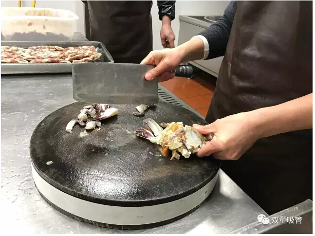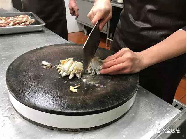 13、螃蟹宰殺完(wán)畢後(hòu)放菜板將蟹腳(jiǎo)去除,大腳砍成三段、小腳砍成兩段。