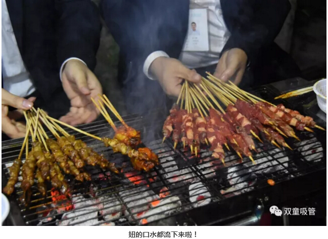 雞翅肉串、羊肉牛肉、年糕香(xiāng)腸……生日會辦成了自助燒烤、篝火酒會,推杯換盞,大聲(shēng)調笑,氣氛 so hot!什麽都別說,也別問吸管妞到底吃了多少羊肉串(chuàn),大家隻要看看這些(xiē)照片,再分享一下就行了!
