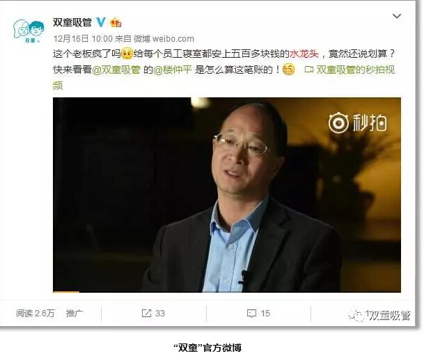 許多民營企業都認為不必(bì)給員工用太好的硬件,希望用最低的成本創造最大的價值。因此,前段(duàn)時間,“雙(shuāng)童”官方微(wēi)博發布了一條關於12年前老板(bǎn)給每個員工寢室(shì)配置了五百多元高(gāo)級水龍頭的微(wēi)博就引發了網友的熱議,不少粉(fěn)絲都很詫異一個水龍頭五百多元老板居然說不貴!這樣(yàng)的高硬件配置究竟是低成本還是高成本?今天吸管妞就和大家來好好算算這(zhè)筆賬劃不劃算!