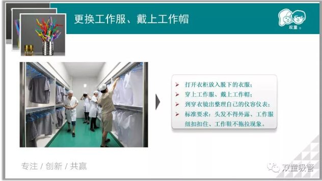 3、來到(dào)第二更衣(yī)區(qū)換上工作服,帶上發網及工作帽,佩戴好(hǎo)之後要進行檢查,確認頭發(fā)不外露,帽帶已係好。