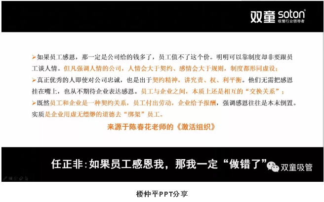 接下來,樓仲平也以陳春花老師《激活組織》中任正非的案例分享了員工和(hé)企(qǐ)業之間應該是良性的契約(yuē)關係。任正非認為(wéi):如果員工感恩,那一定是公司給的錢多了,員工值不(bú)了這個價。真正優秀的(de)人即使對公(gōng)司(sī)忠(zhōng)誠,也是出(chū)於(yú)契約精神,講究責、權、利平衡。員工與企業之間,本(běn)質上還是相互的“交換關係”。既然員工和企業是一種契約關係,員(yuán)工付出勞動,企(qǐ)業(yè)給予報酬,強調感恩往往是本末倒置。實質是企業用虛無縹緲的道德去“綁架”員工(gōng)!