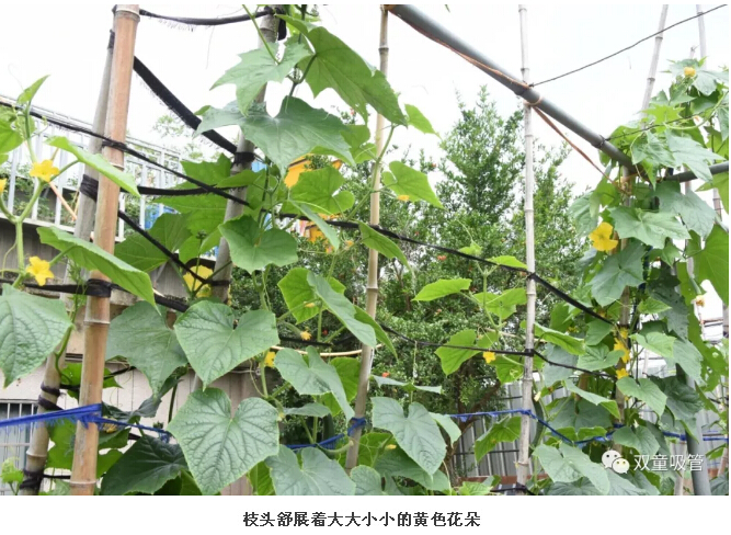 剛進菜園,映(yìng)入眼簾鬱鬱(yù)蔥蔥的一片,藤架上掛滿了碧(bì)綠的枝葉,藤蔓葉片下懸著肥嫩水靈的黃瓜。枝頭舒展(zhǎn)著大大小小的(de)黃色花朵,隨風飄出淡淡的花香,在陽光的(de)照耀下顯得分外美麗(lì)!