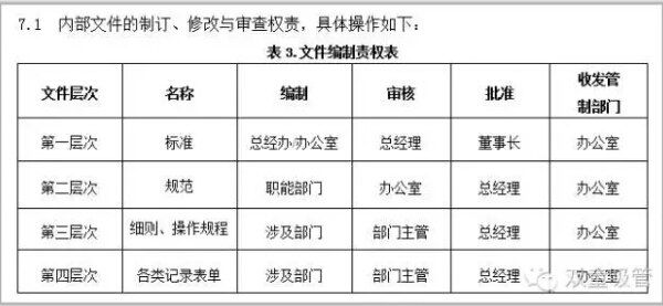第三層次文件:管理細則、操作規程、技術(shù)標準等作為各部門運行(háng)管理活(huó)動的常用實施細則:包括管理標(biāo)準、操作流程、技術(shù)標準(國家標準、行業標準、企業標準及作業指導書)等;