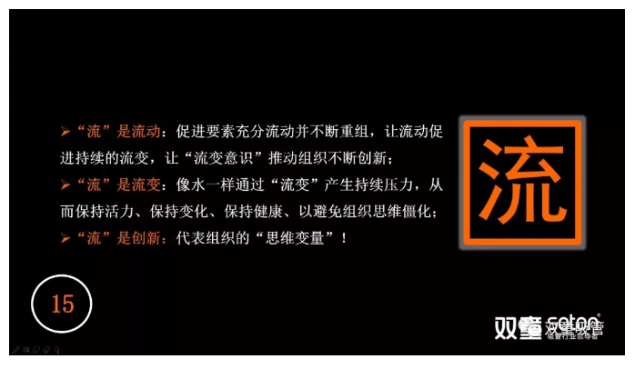 首先,“流”代表的是在高速變化的時(shí)代下,資源和信息高速流變,人才高度流動……我們要通過主動的方式、迎合(hé)的方式、應變的方(fāng)式、創新的方式(shì),從(cóng)而保持企業有(yǒu)序流動,保持(chí)創新。