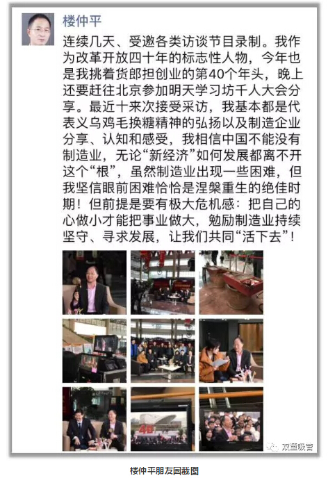 節目錄製結束之後,樓(lóu)仲平也在朋友圈感言:連續幾天、受(shòu)邀“改革(gé)開放40周年”訪談節目,我基本都是代表義烏雞毛換糖精神的弘揚以及製(zhì)造企業分享(xiǎng)、認知和感受,我(wǒ)相信中國不能沒有製造業,無論“新經濟”如何發展都(dōu)離不開這個(gè)“根”,雖然製造業出現一些困難(nán),但我(wǒ)堅信眼前困(kùn)難恰(qià)恰是涅槃重生的絕(jué)佳時期!但前提是要有極大危(wēi)機感:把自己的心做小才能把事(shì)業做大,勉勵製(zhì)造業持續堅守、尋求發展,讓我們共同“活下去”!