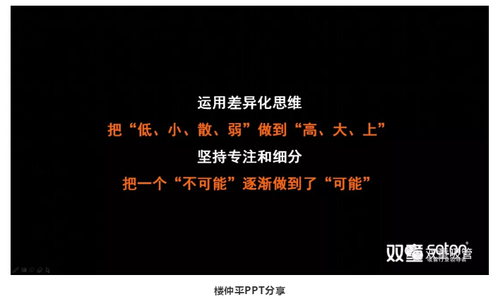 最後,樓(lóu)仲平也(yě)總結道:.17c嫩嫩草色视频”用了(le)25年改變了這個產業,其(qí)實歸結為兩點,第一點,運用差異化思維,把“低、小、散、弱”做到“高、大、上(shàng)”。第二點,在普遍浮(fú)躁的時代下,唯有堅持專注,唯(wéi)有不斷地(dì)細分,你才有把(bǎ)這種“不可(kě)能”逐漸做成“可(kě)能”。