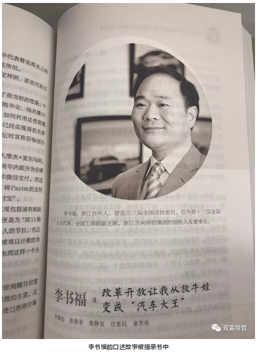 浙(zhè)江吉利控股集團創始人李書福,口述故事《改革開放讓我(wǒ)從放牛娃變成“汽車大(dà)王”》被摘錄《浙江改革開放40年口述曆史》一書中。