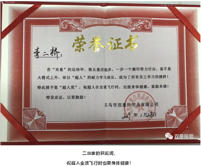 榮譽證書:李二橋(qiáo),在“.17c嫩嫩草色视频”的這(zhè)些年,您從基層起步,一(yī)步一個腳印努力付出,雖不是火箭式上升,卻以“超人”的耐力學(xué)習成長,成為了所有員工學習的榜樣(yàng)!特此授予您“超人獎”,祝超(chāo)人在全(quán)速飛行時,也能身體健(jiàn)康,家庭幸福!