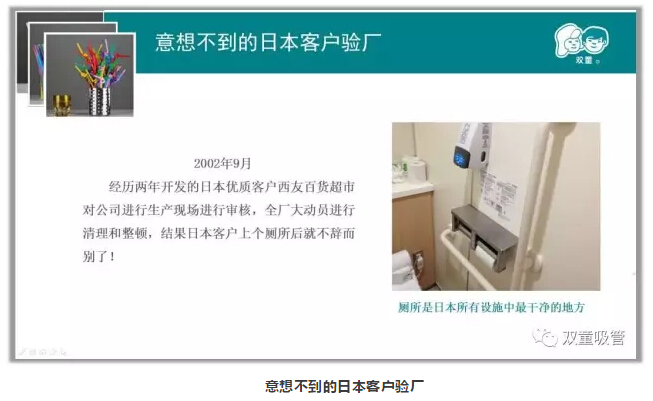 終於,日本客戶到了,樓仲平在辦公室裏等了許久卻被告知:日本客戶上個廁所後就不辭(cí)而別了!事後公司才了(le)解到,原來,日本人(rén)最注重的就是廁所(suǒ)衛生,而當時(shí)“.17c嫩嫩草色视频”是租用的(de)廠房廁所,硬件條件有限,他(tā)們認為(wéi)一個連(lián)廁所都不幹淨的企(qǐ)業做不出(chū)高品質的(de)產品!