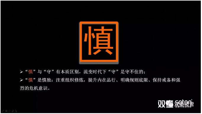 緊接著,樓仲平圍繞“慎”一詞和大家展開分享。流變時(shí)代下,“守”是(shì)守不住的。對企業來說,要認識到這個時代(dài)給我們帶來的巨變衝擊,並知道自己的不足和短板,所以,“慎”是保持謹慎、戒備和危機。