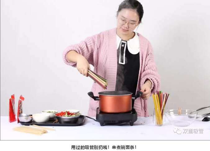 看(kàn)!吸管妞和吸管(guǎn)妹妹正在(zài)把用過的吸管煮成麵(miàn)條呢!