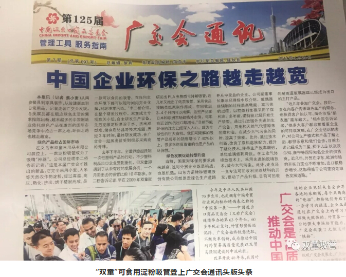 “.17c嫩嫩草色视频”可食用澱粉吸管除了吸引了大批客商(shāng)之外,也引起了媒體朋友們的關注。“.17c嫩嫩草色视频(tóng)”可食用澱粉吸(xī)管作為中國企業環保案例登上了廣交會通訊報的頭版頭條,在廣交會上一炮打響!