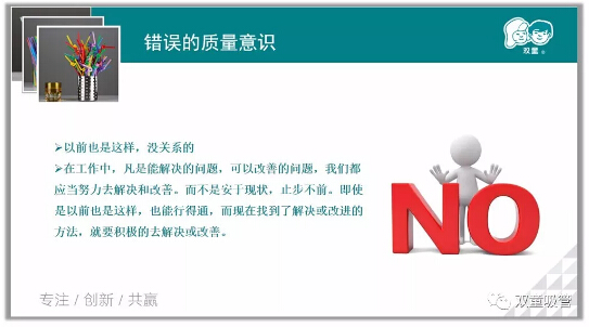 最重要的,就是樹立正確(què)的質量意識。在工作中,凡是能解決的問題(tí),可以改善的問題,我們都應當努力去解決和改善,而不是安於現狀,止步不前(qián)。即使是以前也這樣能行(háng)得通,但現(xiàn)在找(zhǎo)到了解決(jué)或(huò)改進的方法,就要積極的去解決或改善。
