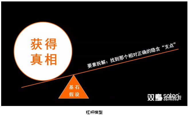 它背後的邏輯其實很簡單,即通(tōng)過不斷地要素拆(chāi)解,找到(dào)相對正確的“基石假(jiǎ)設”,把它作為一個支點,從而撬動了思維。