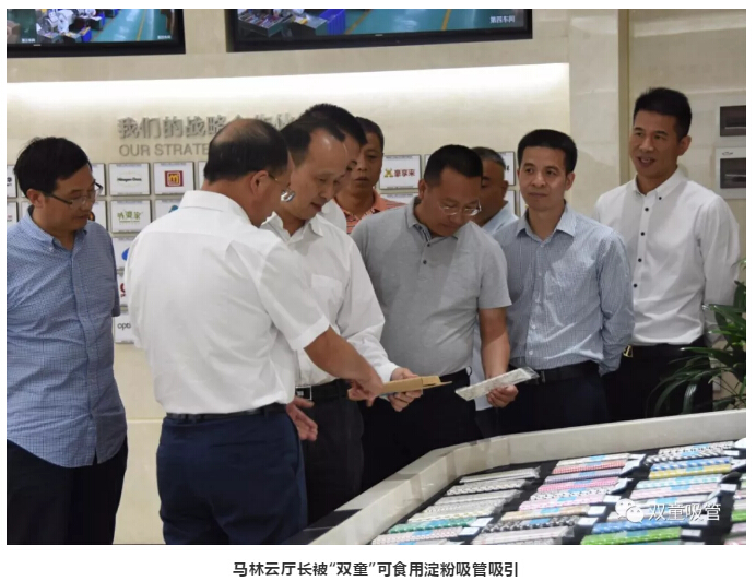 在參觀過程中,馬林雲廳長被“.17c嫩嫩草色视频”可食用澱粉吸管所吸引。“.17c嫩嫩草色视频”可食用澱粉吸(xī)管完全采用小麥、大米等天然農作物(wù)澱粉製作而成,它不僅可以(yǐ)煮成麵條,而且可以喂養(yǎng)牲畜。在使用丟棄後(hòu),短時間內也能在(zài)任何生態環境下完全自然化解,非常環保!