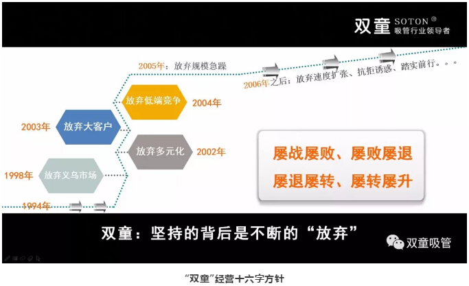 現在,我們通(tōng)過“屢退屢(lǚ)轉,屢轉(zhuǎn)屢升”,擺脫了(le)原先薄利多銷的粗放經營,轉變了大家對吸(xī)管行業 “低、小、散、弱”的傳統認知,改變了吸管行業的傳統發展方式,促進了(le)整(zhěng)個吸管(guǎn)行業的產業鏈(liàn)升級。