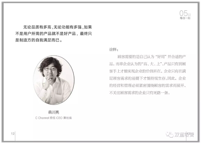 無論品質有多高,無論功能有多強,如果不是用戶所需的產品就不是好產品,最終隻(zhī)是製造方的自我滿足而已。——森川亮