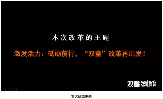 原來,“雙(shuāng)童”當家人樓仲(zhòng)平充分認知到社會環境的(de)複雜性、時代的巨變性和企業的自然墮變性,與總經理李二橋充分(fèn)評估時勢,權衡舍得,決定再次發起2019企業重大(dà)改革,以此激發活力、砥礪前行,通過“向死而生”的命題(tí)假設讓團隊認知(zhī)到雙(shuāng)童離“死亡(wáng)”隻有六個月,以此激發(fā)員工的危機感,從而讓“雙(shuāng)童(tóng)”再次脫離(lí)“舒適區”,遠離“危險區”,進(jìn)入(rù)“恐慌區”,以此激發(fā)組織活力!