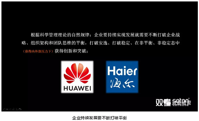 接下來,樓仲平用華為及海爾的(de)案例,引導大家認知:企(qǐ)業要(yào)持續實現發(fā)展就需要不斷打破企業戰略、組織架構和團隊思維(wéi)的平衡,打破安逸、打破穩定、在非平衡、非穩定態中(獲得內外部壓力下(xià))獲得創新和突破(pò)!