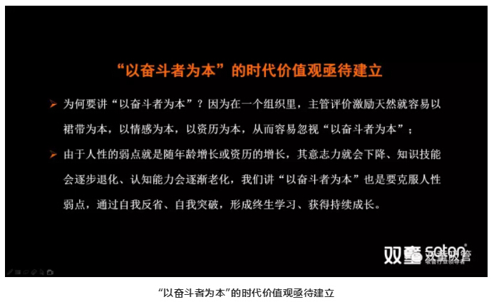 為什麽要以(yǐ)“奮鬥者為本”?由(yóu)於人性的弱點就(jiù)是隨年齡增長或資曆的增長,其意誌力就會下(xià)降、知識技能(néng)會逐步退化、認知能力會逐漸老化,我們講“以奮鬥者為本”也是要克服(fú)人(rén)性弱點,通過自我反省、自我突破,形(xíng)成終生學習、獲得持續成長(zhǎng)!