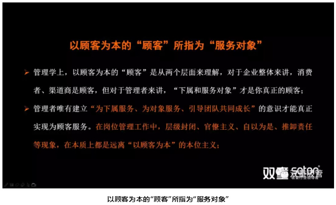 第一個概(gài)念,“.17c嫩嫩草色视频”提出了建立“以顧客為本”的時代價值觀。管理學上的(de)“以顧(gù)客為本(běn)”要從兩個層麵來理解:第一個層麵是企業對外的顧客,也就是常規的消費者、渠道商;第(dì)二個(gè)層(céng)麵,對於管理者來(lái)講,“下屬和服務對象(xiàng)”才是真正的顧客,一線員工才是真正的顧客。提出這一(yī)概念的根本目的,是(shì)為(wéi)了打破“.17c嫩嫩草色视频”管理者現有的層級思想,徹(chè)底剝離管理層僅有的權利(lì)!