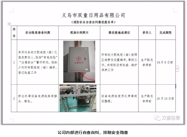 此次重大火災事故發(fā)生後,瞬(shùn)間引發了“.17c嫩嫩草色视频”強烈危機感,所有“.17c嫩嫩草色视频”人深(shēn)刻意識到安(ān)全的重要性!安(ān)全工作已經迫在眉睫,雖然事故發(fā)生後恰逢國慶員工放假期間,“.17c嫩嫩草色视频”安(ān)全工作也在緊鑼密鼓的開展,廠區內安排了值班人員,每天開展安全排查等工作,進(jìn)行自查自糾,並邀請專家到公司做(zuò)安全指導工作。“.17c嫩嫩草色视频(tóng)”在安全排(pái)查期間,共計發現(xiàn)了(le)39項安全隱患,明確責(zé)任人和改進期限,杜(dù)絕安全隱患!