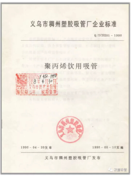 1.1997年:《聚丙烯飲用(yòng)吸管》企業(yè)標準;