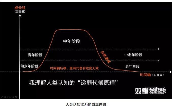 所以,我用一個“認知(zhī)能力”思維(wéi)模型給大(dà)家說明:人類發展(zhǎn)中的(de)成長性(xìng)是能夠無窮拓展的。比(bǐ)如正常(cháng)來講,看一個人的認知能力,從幼年、少年、青(qīng)年,到中年(nián)處於一個鼎盛(shèng)階段,到中老年階段之後就進入到(dào)自然遞減的過程。