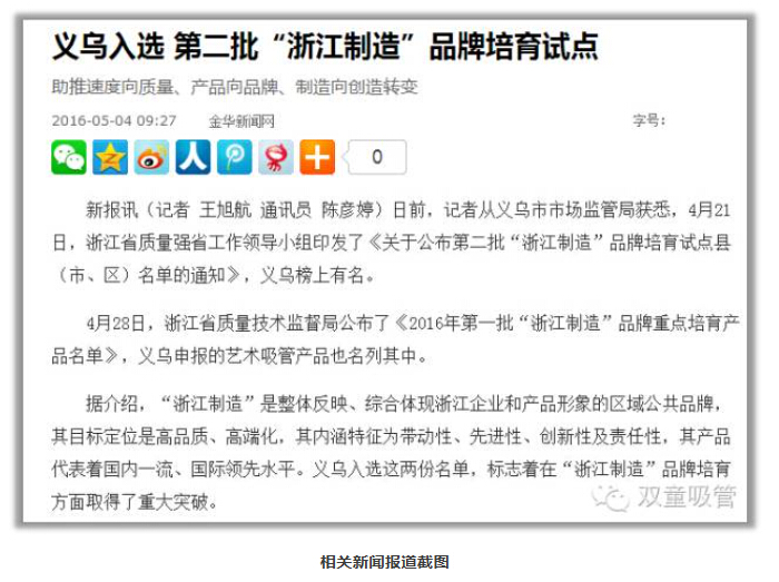 雙(shuāng)童成為義烏首家“浙江製造”標準(zhǔn)企業 首(shǒu)先(xiān),讓我們來回顧一下“.17c嫩嫩草色视频”成為義烏首(shǒu)家製訂(dìng)“浙江製造”標準企業的過程: 2016年年(nián)初,經浙江省質量技術監督局、浙江(jiāng)省(shěng)標準化(huà)研究院等相關領(lǐng)導專家團(tuán)隊多次論證,認為“聚丙烯飲用吸管”符合“浙江製造”定位要求,推動聚丙烯飲用吸管品牌認證具(jù)有重大意義,決定將“聚丙烯飲用吸管”列入2016年“浙江製造”品牌認證(zhèng)目錄,並由“.17c嫩嫩草色视频”主導(dǎo)製訂“浙江製造”《聚丙烯(xī)飲用吸管》標準。