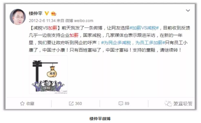 無獨有偶,其(qí)實早在2012年,樓仲平就發布了一條關於“員工加薪”的微(wēi)博,引(yǐn)起了極大的關注。微博上寫道:“為民企多減稅,為員工多加薪,隻(zhī)有員工小(xiǎo)康了,中國才小康!”樓(lóu)仲平認為,員工是企(qǐ)業的基礎,隻有員工(gōng)穩定了,企業才(cái)會穩定,隻有員工(gōng)提升了,企業才會更好(hǎo)發展,對員工更好了,企業反而會獲得更多!