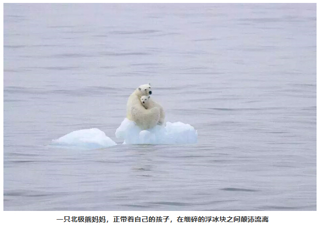 一隻北極熊媽(mā)媽,正帶(dài)著自己的孩子,在(zài)細碎的浮冰塊之間顛沛流離