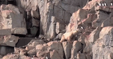 沒有了冰的掩護,北極熊在陸(lù)地(dì)上十分笨拙,為了填飽肚子,隻能被逼爬到陡峭的懸崖上捉鳥。