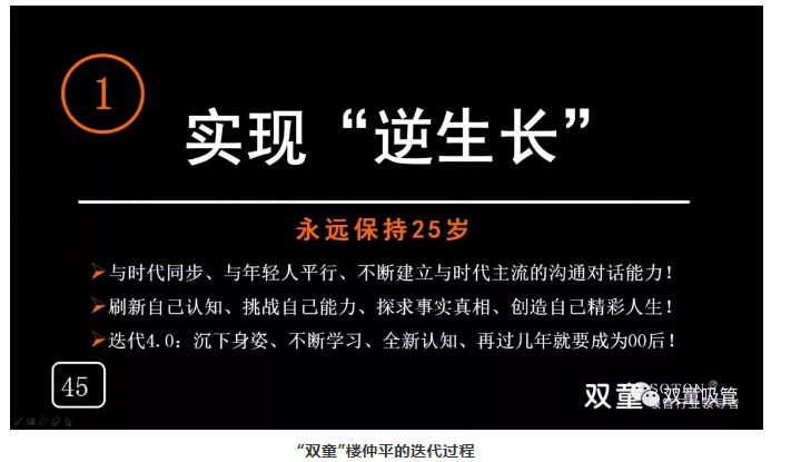 而要實現持續成長,“雙(shuāng)童”樓仲平認為:在巨(jù)變時代下,成長就需要克服人性弱點的(de)惰性,不斷地進行自我迭代,與年輕人為伍,不斷與他們發生鏈接和建立對話的能力,從而獲得持續成長!
