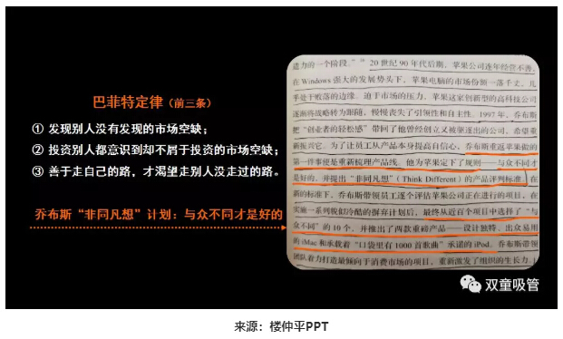 以巴菲特定律的前(qián)三(sān)條與喬布斯的“非同凡想”計劃為例,“雙(shuāng)童”樓(lóu)仲平引導在(zài)座(zuò)企業主們認知:與眾不(bú)同才是好的!