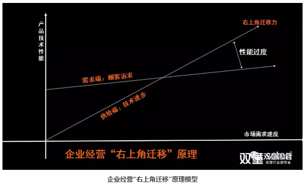 當企業經營的“右上角遷移”力高於需(xū)求端客戶訴求的“右上角遷(qiān)移”力時(shí),將會(huì)產生(shēng)“性能過度”。由此看出,這個過程(chéng)當中企業所投入的大量成本,大量技術研發,大量創新實(shí)際上是造成了巨大浪費(fèi)。