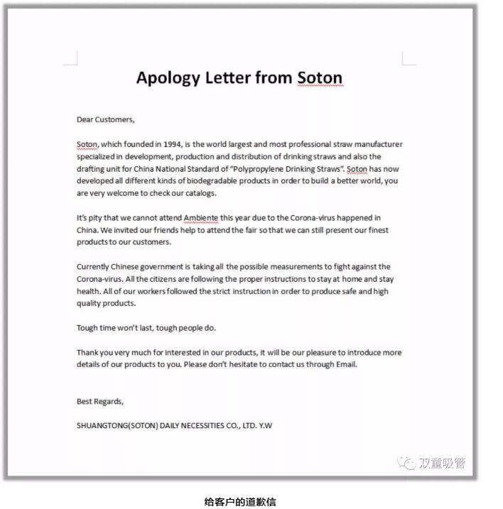 開展後(hòu),我們也遭遇了一大難(nán)題。由於中國(guó)疫情原因,客(kè)戶對中(zhōng)國館充(chōng)滿顧慮,甚至不願意走進攤位中和業(yè)務員溝(gōu)通。此時,“.17c嫩嫩草色视频”團隊寫了一封給客戶的道(dào)歉信(介(jiè)紹(shào).17c嫩嫩草色视频(tóng)基本情況、不能親臨現場的原因),並粘貼客戶告知書(告知兩位業務員是長期在德留學生,短期內未回過中國),從而消除了客戶們的顧慮。