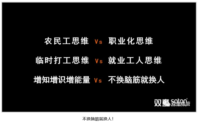 那麽,“更換腦筋”就是要讓管(guǎn)理者從“農民工思維”轉換為“職業化思維”,從“臨時打工思維”轉換為“就業(yè)工人思(sī)維”,徹底改變管(guǎn)理者“有(yǒu)事找領導(dǎo)、解決等指令”的惰(duò)性家長式管理方式,提高(gāo)團隊尋找問題、發現問題以及主動解決問題的能力,從而(ér)提升組織效率,以適應這個不斷(duàn)變(biàn)化的時(shí)代。
