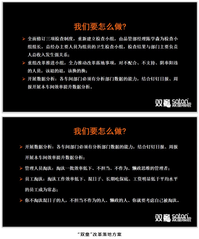 在樓仲平分(fèn)享結(jié)束後,總經理李二橋和大家分享了全麵圍繞提(tí)升組織(zhī)效率而展開的改革落地方案,包括重建“.17c嫩嫩草色视频”改革小組和(hé)安全(quán)衛生秩序檢查小組、形(xíng)成崗位競爭推動優勝(shèng)劣汰、推動車間數據分(fèn)析能力、全麵做(zuò)好改革宣傳工作和文化(huà)引導工作、結合線上(shàng)辦公平台提升企業信息化水平等,在企業內部建立起“以奉獻者為先(xiān)、以奮鬥者為本”的新時代價值觀(guān)!